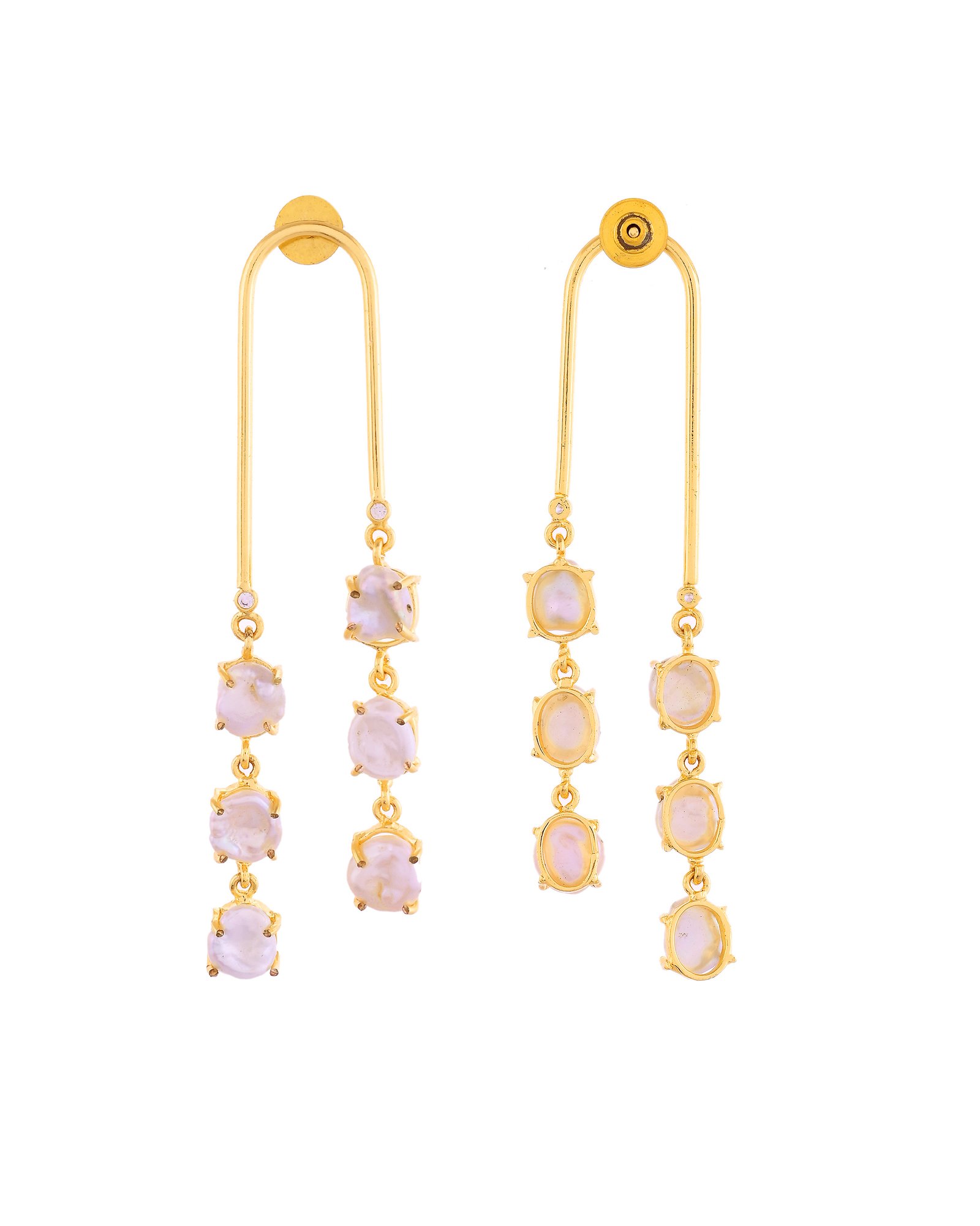- Polished gold hooks frame a vertical drop of luminous pearls