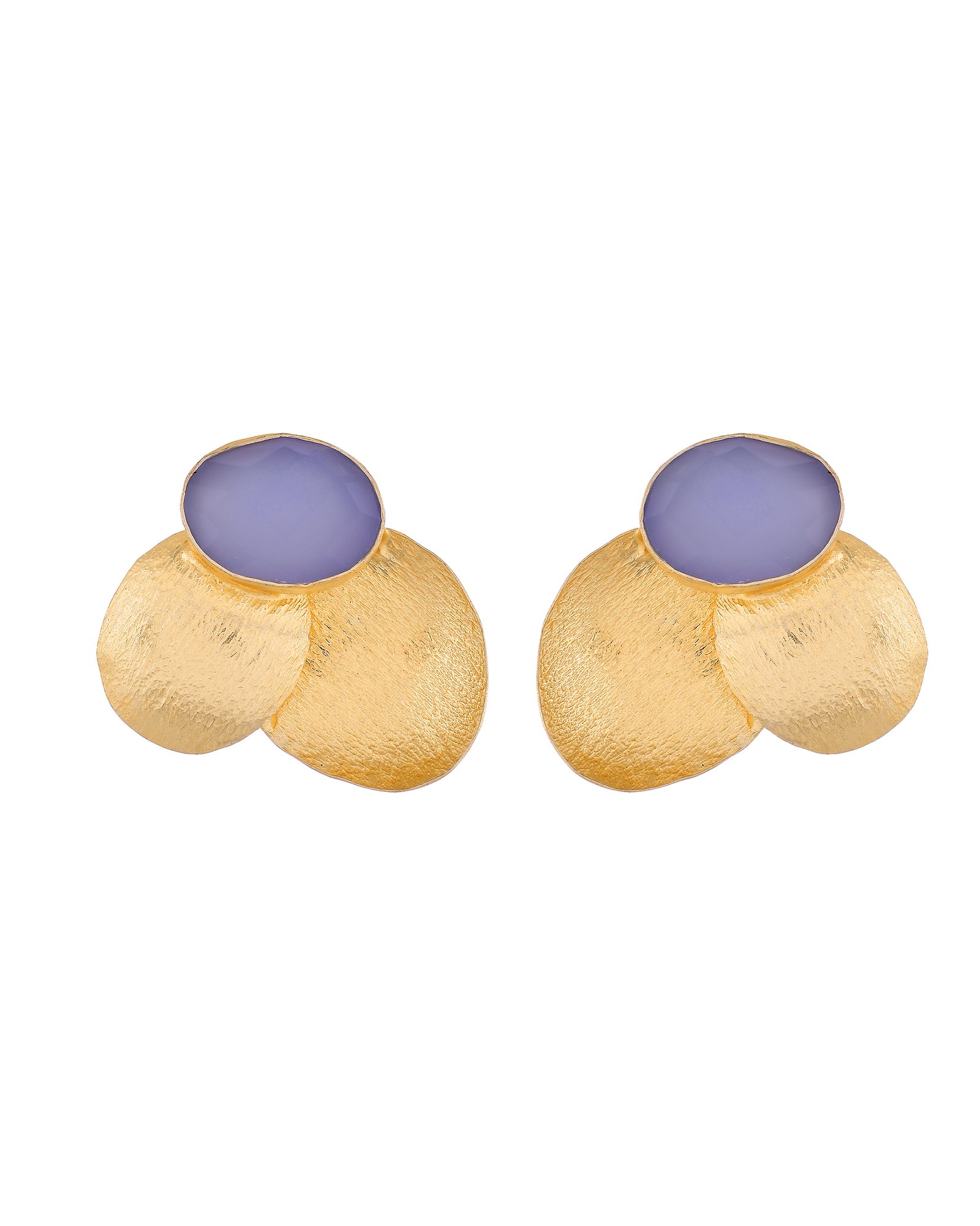 - Material & Colour: Gold-toned alloy shaped into petal-like frames with a soft slate-blue center stone