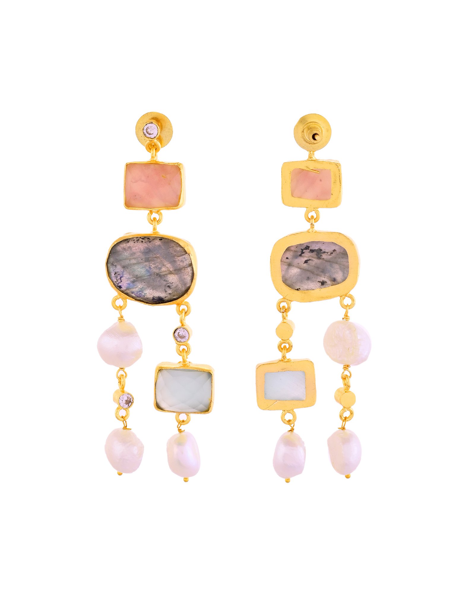 - Style: Drop earrings with multicolored gemstone and pearl arrangement