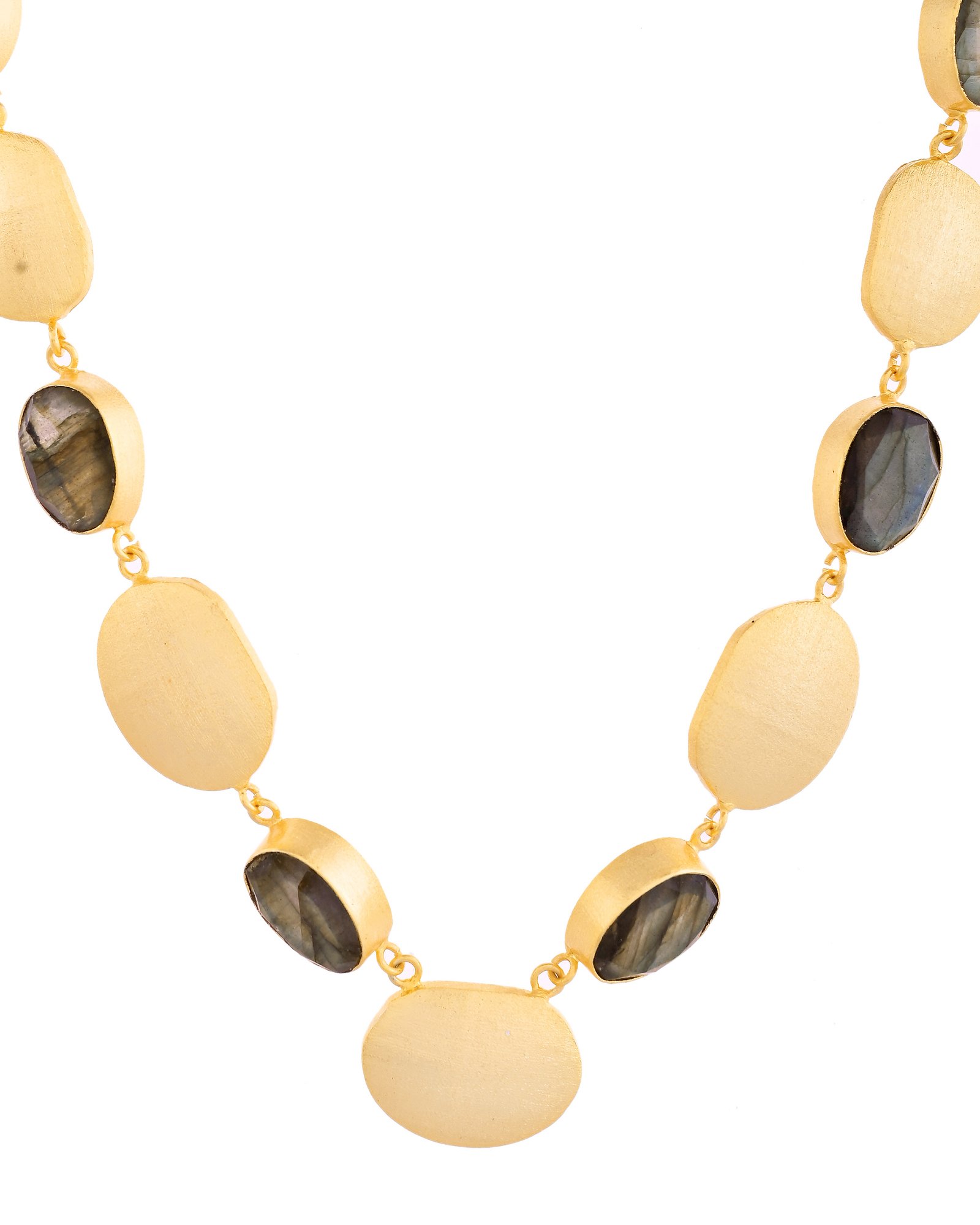 • Matte gold discs and polished dark oval stones alternate along the chain for rich contrast
