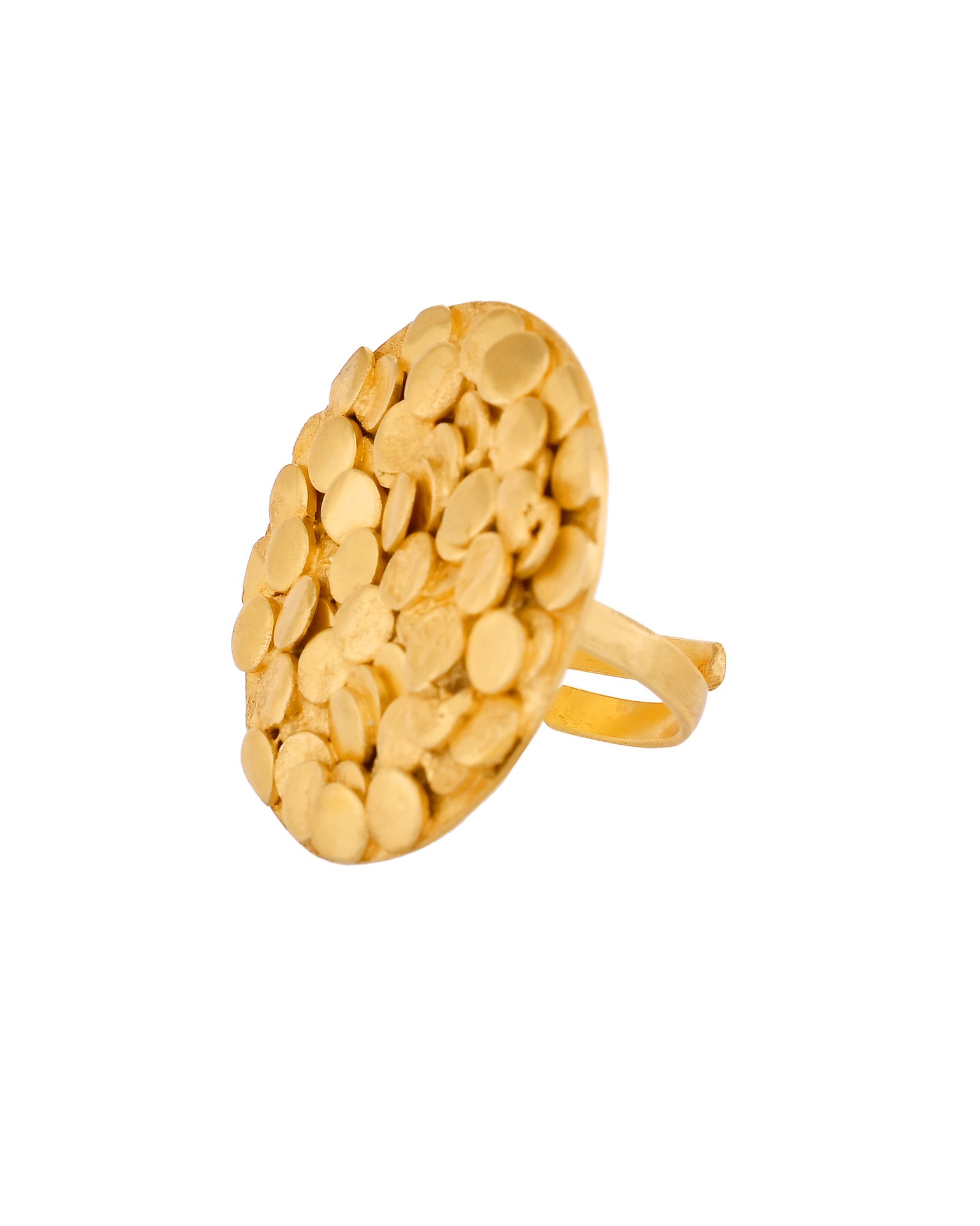 - Material & colour: Polished gold band with round top featuring tightly packed mini gold discs